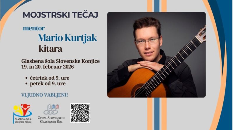 Na Glasbeni šoli Slovenske Konjice (v mali dvorani na dislocirani enoti Trebnik, Grajska ulica 4, Slovenske Konjice) se bo 19. in 20. 2. 2026 odvil mojstrski tečaj prof. Maria Kurtjaka.